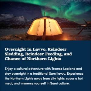 Available daily with guides speaking English, Spanish, French, Italian and German. Duration: 6 – 8 Hours under the Arctic sky. Includes: Warm drinks & tasty snacks Location: Chosen nightly based on the forecast
